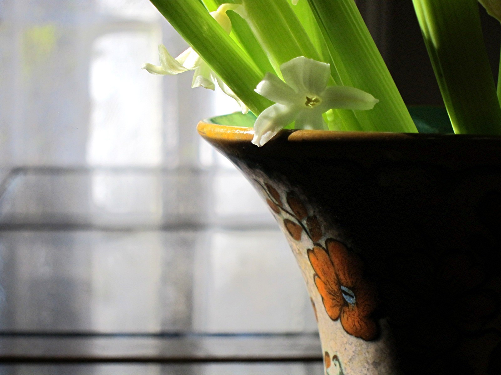 I recently brought her some white hyacinths… the blossoms were just beginning to unfurl, and the fragrance was heavenly. Later in the evening, H emerged from his mom’s living room with a look of excitement. She had chosen a vase that I had never seen before, but one that H remembered from his childhood. I later learned that she had received this hand-painted gift almost 70 years ago, as a young woman in Holland. I’m delighted that this treasure is once again seeing the light of day.