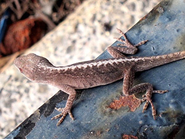 While recently dining outside at a local café, H and I watched as this fellow crawled across a tabletop, leaped to the chair seat, and shimmied down the metal leg before stopping to regroup on a fence rail.  It held still long enough for photos and then scampered off into the bushes.  The little girl next to us squealed with delight at seeing the lizard.  I was squealing too (in my mind, of course) at having the chance to observe something so common and yet so beautiful and extraordinary.