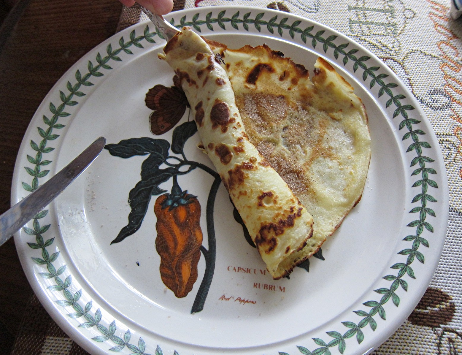Ooooo, this brings back memories of how delighted we were as children when my mother made pancakes. She did so only occasionally, but it was an occasion! Try adding a squirt of lemon juice in with the cinnamon and sugar, yum…