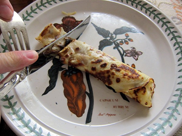 Every so often H’s mom whips up a batch of pannekoeken. These Dutch pancakes are a bit different from their American counterparts in that they are light, very thin, and usually large enough to cover the plate. The ingredients are similar (flour, butter, milk, eggs), with apples or raisins or various other goodies sometimes added. Sprinkle your pannekoek with cinnamon sugar, gently roll it with a fork, slice it, and eat.