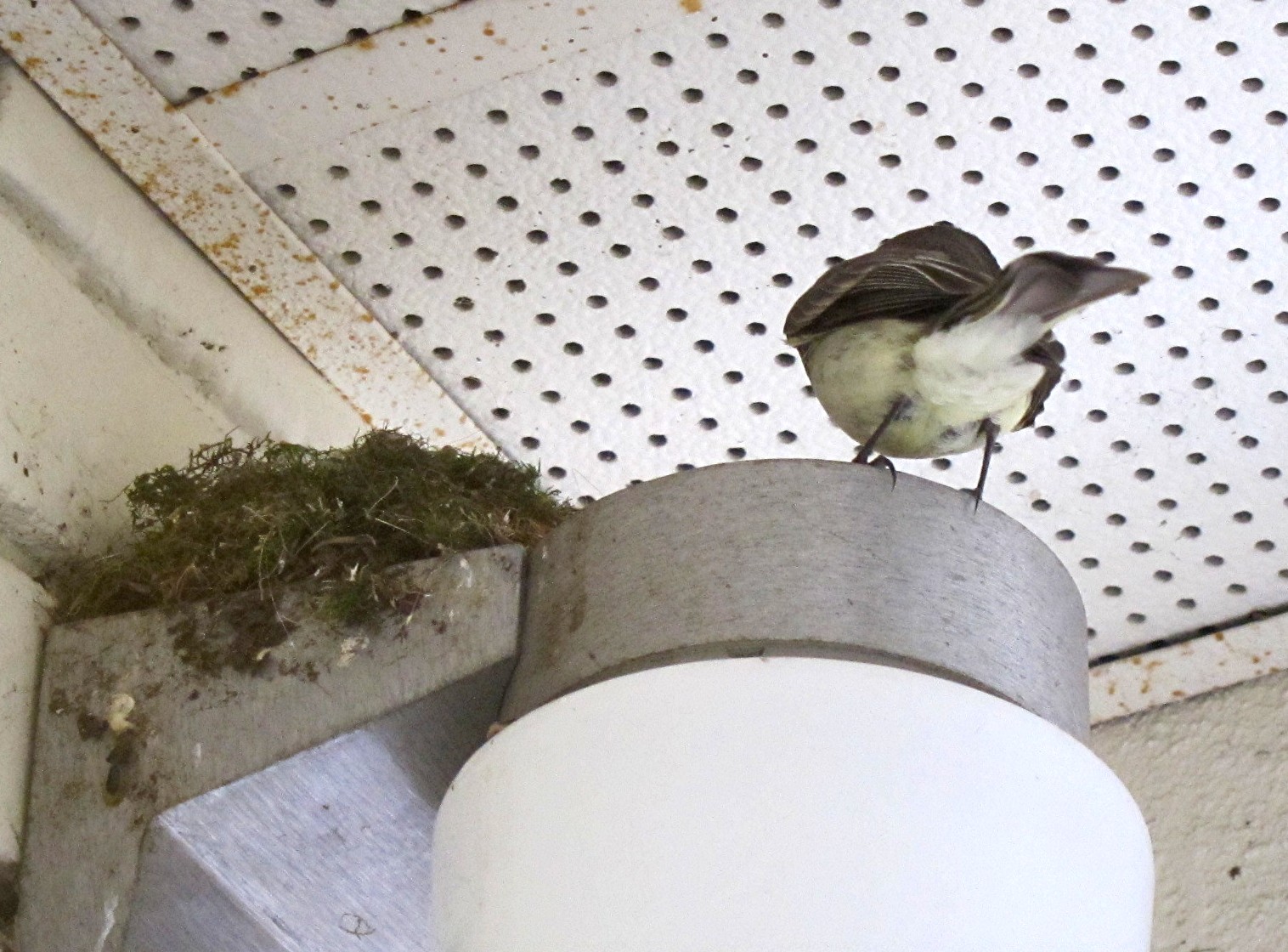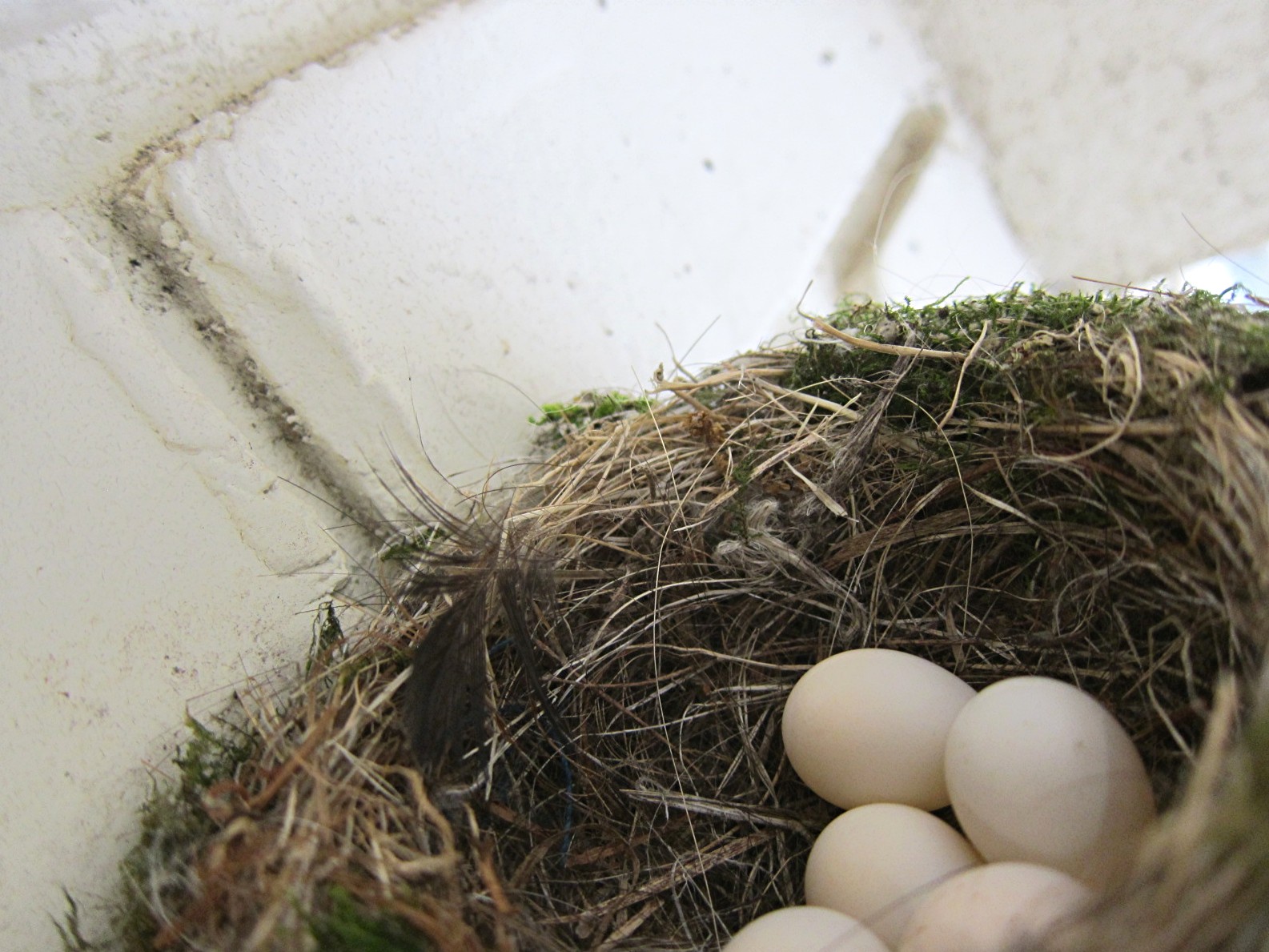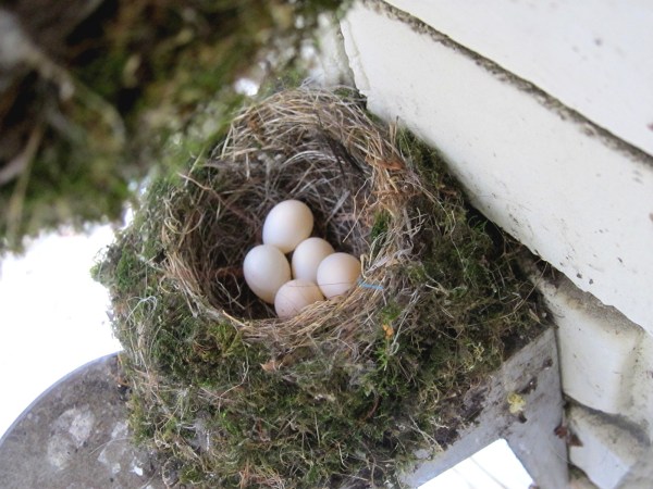 To  my absolute delight, I discovered this nest full of eggs a couple of weeks ago while at work, and I’ve been watching it ever since.  I’m quite impressed with the moss and mud construction of this cozy little abode.  Sturdy and gorgeous… a great combo.  Mom (an Eastern Phoebe, I believe) has been very diligent in her nest-sitting.  We (as if I’m part of the process) should have little peepers any day now.
