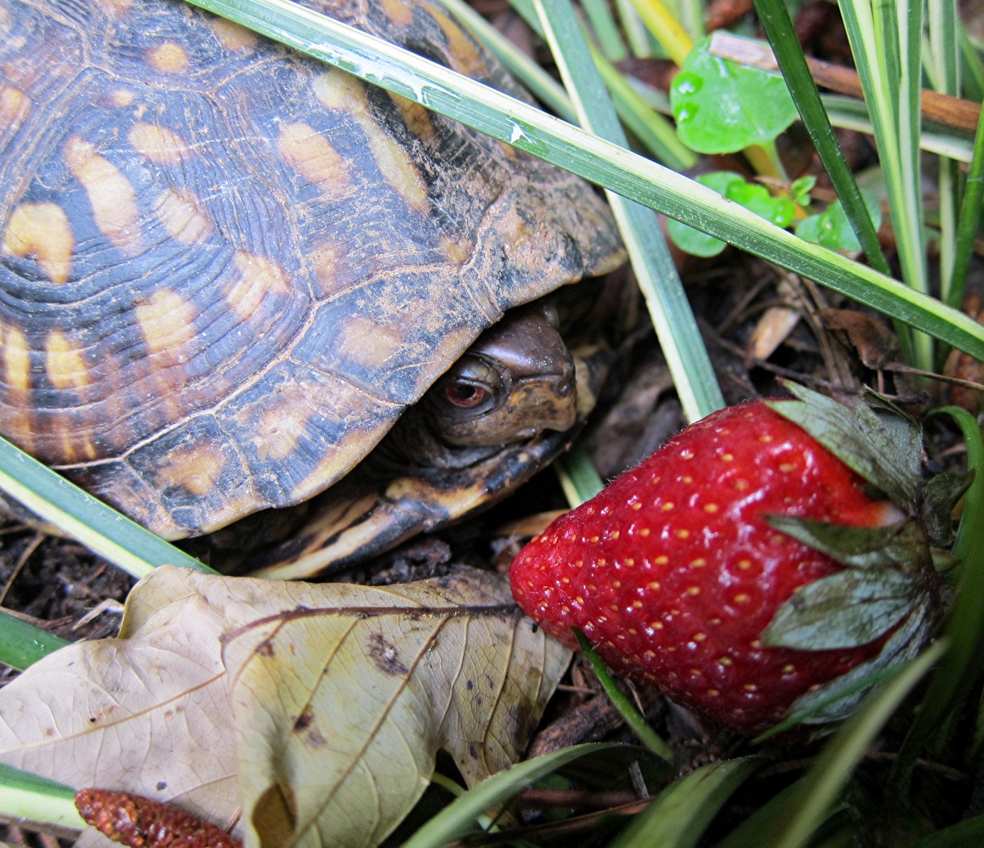 I love turtles – I even collected little fake versions of them for a while – and I’m totally in awe that you find them sauntering through your garden! Lovely photography – I thought it was big at first, till I saw it next to the strawberry 😉