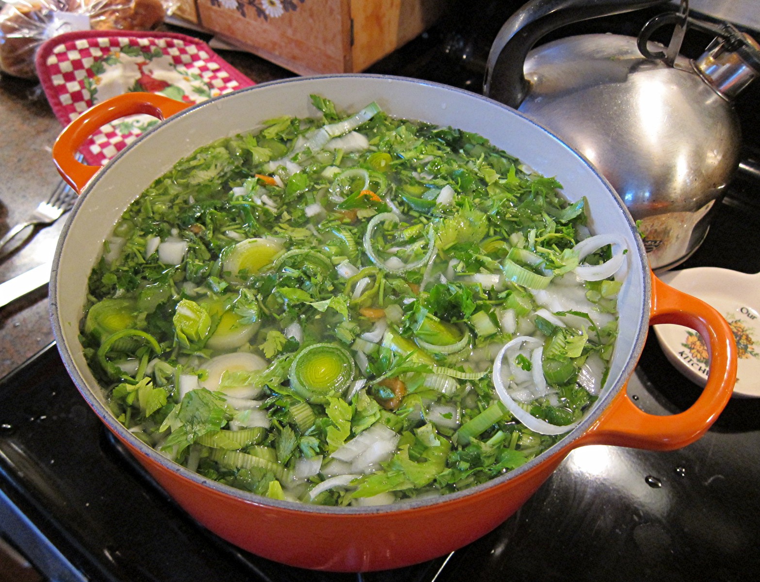 She put 3 pork chops (with bone) in the bottom of the pot and added all the chopped veggies on top of the meat, except for the potato, and poured water over the veggies up to the rim of the pot. We cooked it for about 6 hours total. After the first 3-4 hours (stirring occasionally), she added the potato to thicken it up. At that point the pork chops had cooked and broken down, so she scooped them out and put them in a colander. She held the the colander over the pot and pour water over it to wash the soup back into the pot but also expose the bone from the pork chops. She picked the bones out and put everything back in the pot and cooked for another couple of hours (stirring occasionally). She also cooked a sausage separately, chopped it up and added it at the end. I was surprised at how easy it was to make. Tasty, tasty, tasty!