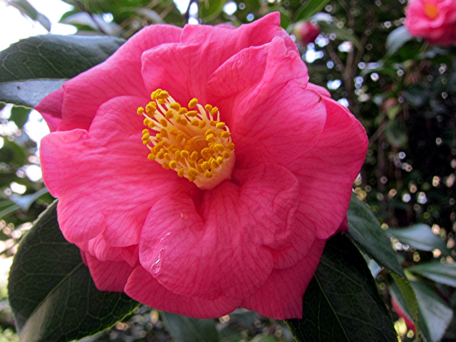 Each year at this time the camellia bushes by our kitchen window begin to bloom, and I never fail to take pictures of their hot pink flowers. Their faithful arrival during this cold and sometimes gray winter season reminds me that we’re halfway to spring.