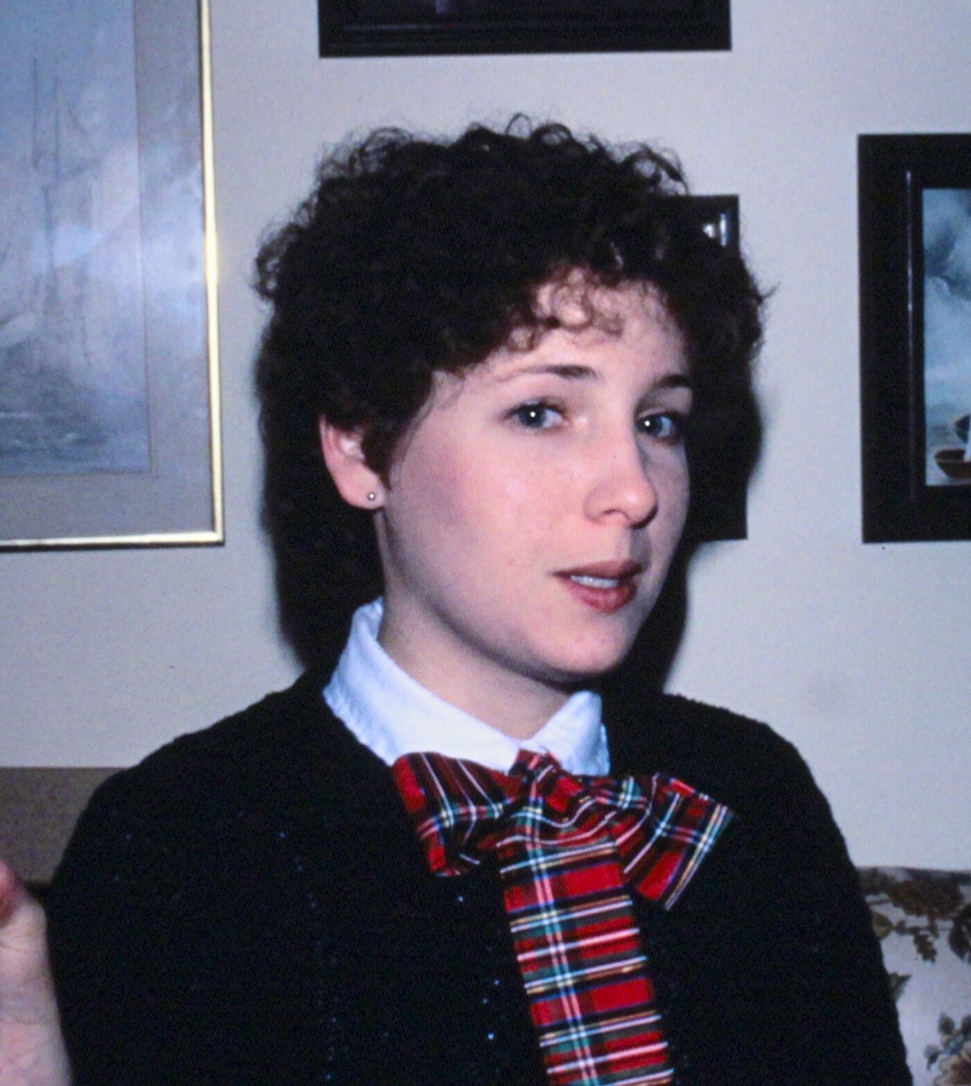 I’ve kept it short ever since, but that doesn’t mean I haven’t tried to add some interest with various styles, cuts, colors… and perms.  I think these tight curls are a very questionable choice.  (The large plaid bow doesn’t help.)
