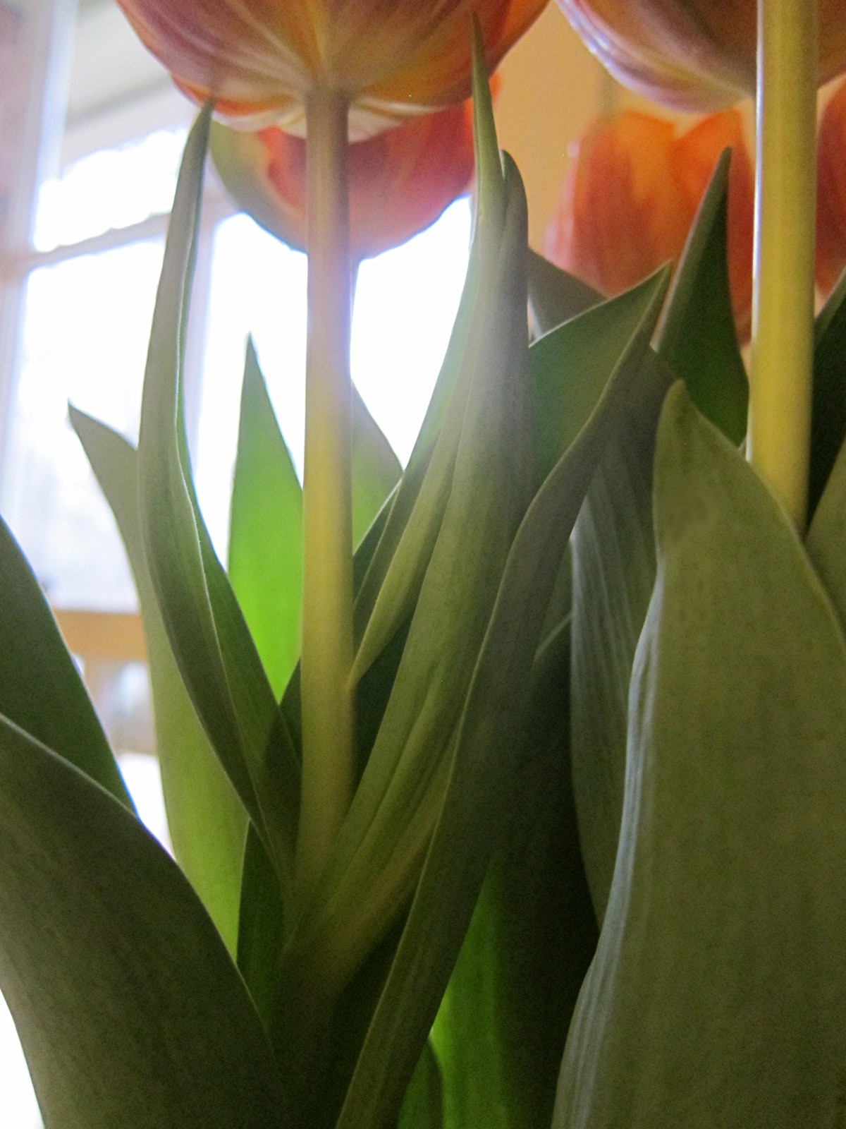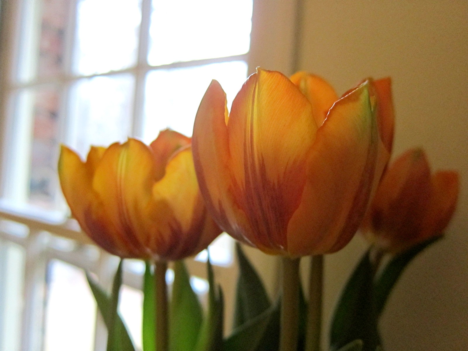 H bought tulips this weekend to brighten up his office. Considering the weather that we’ve had today – dark skies, tornado warnings, rain, and hail – they are just what we’ve needed.