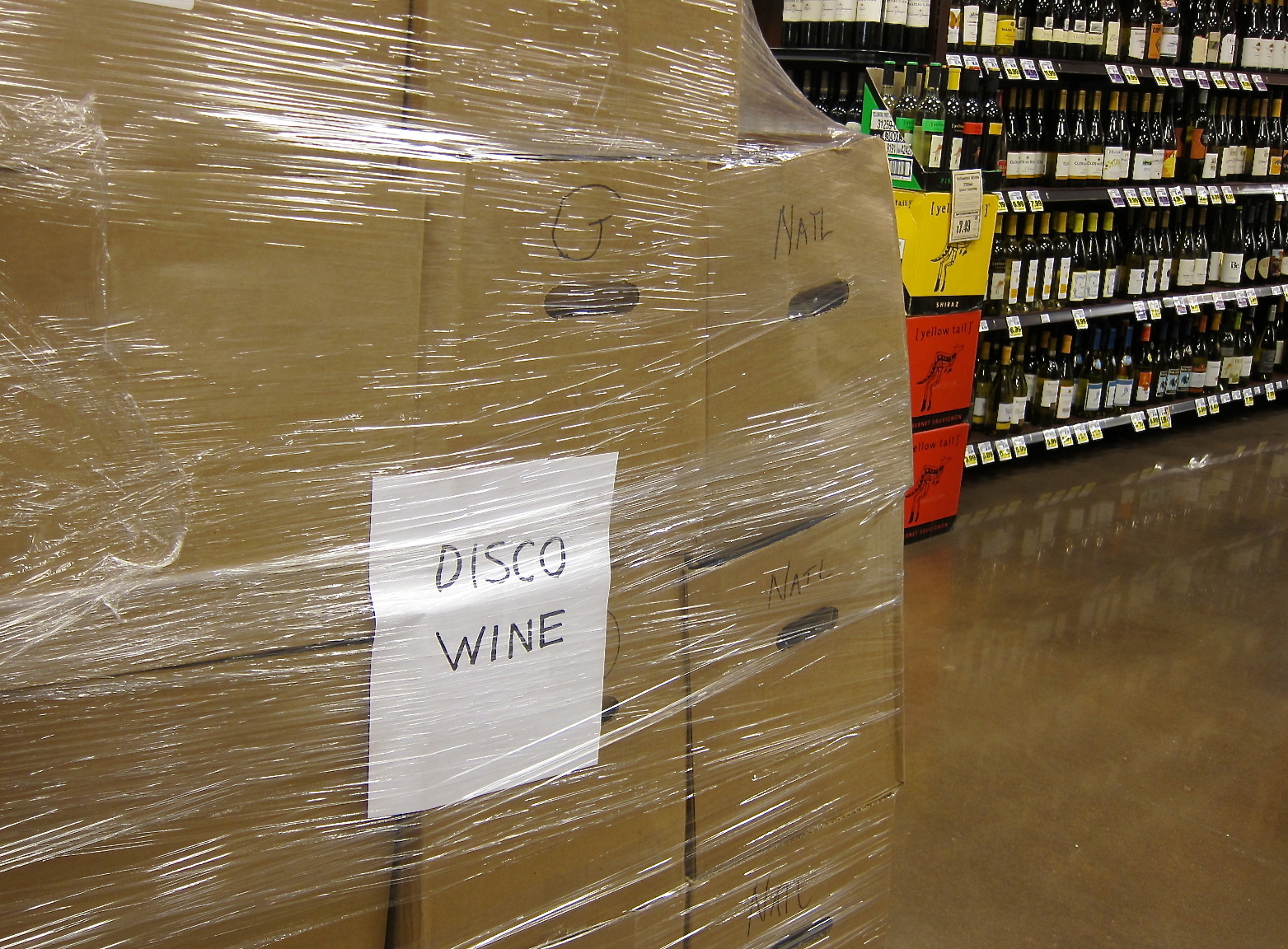 H and I discovered this pallet of wine the other evening while grocery shopping. I had no idea that this notorious dance era had its own official vino.