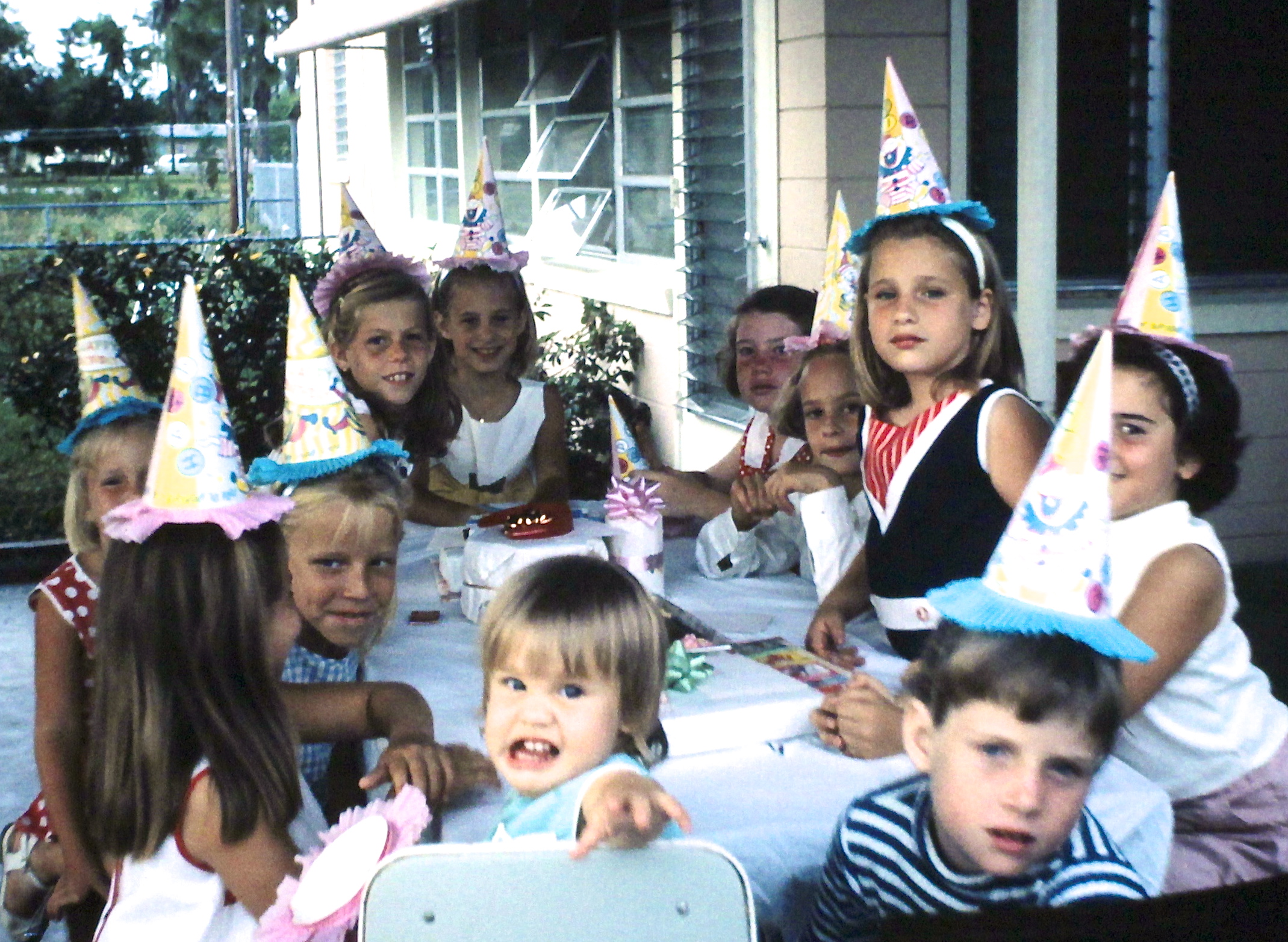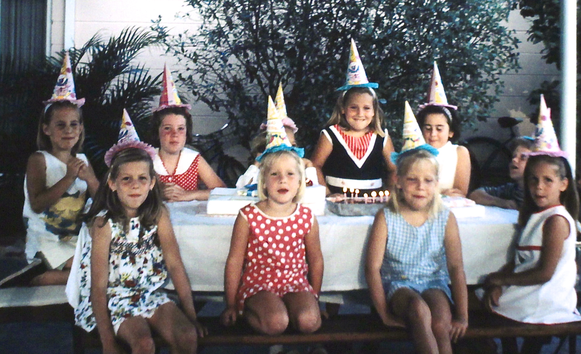 Now THIS is a birthday party (my seventh)… simple fun, homemade cake, and great hats. I love the look of excitement on my face at the prospect of blowing out those candles. (My sister L appears to be a bit squirmy, though.)