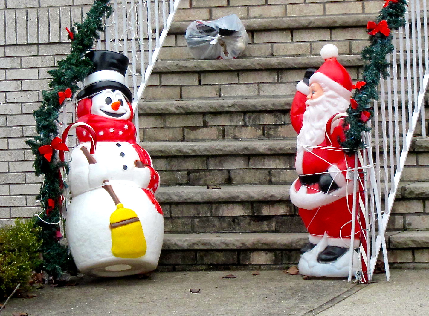 We spotted this jolly pair during a recent whirlwind visit to New York.  I don’t know whether the snowman and Santa are tied up to keep them from blowing away… or to prevent them from walking off.