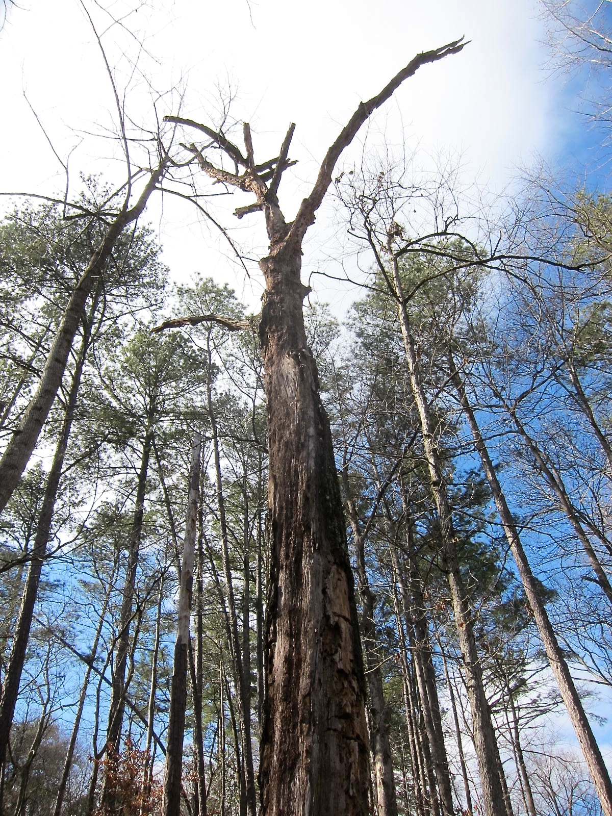 This may look like an ordinary dead tree, but it’s actually the residence of at least one pair of birds. Way up in the topmost branch, a Red-bellied Woodpecker and his mate have laid claim to some interior space and are in the process of renovating. (They’re too small to see in the photo, but you can take my word for it.)