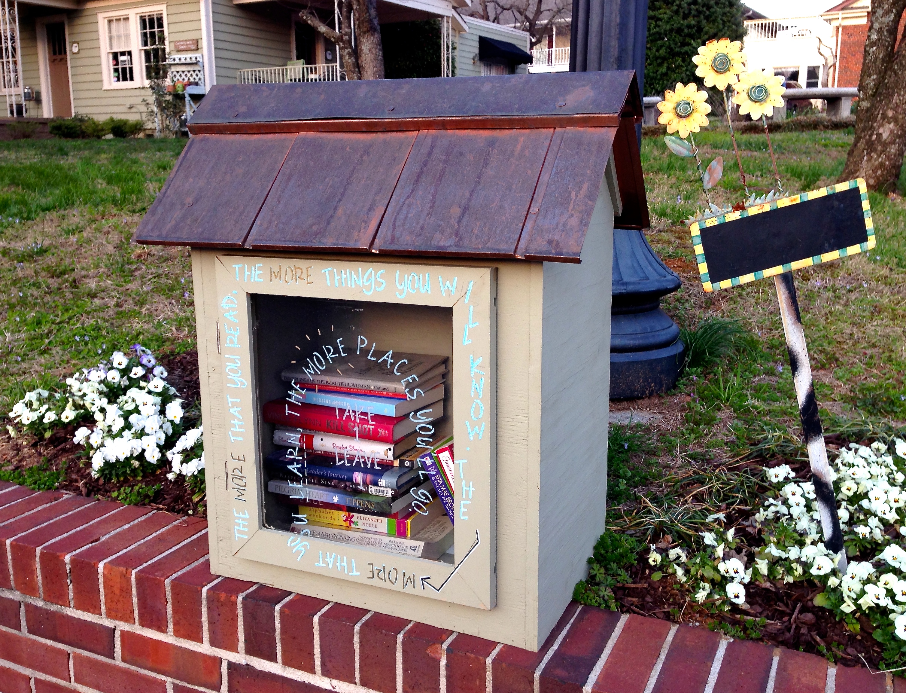 I’ve heard about these miniature lending libraries, but I’ve never seen one before. H and I encountered this one while strolling through downtown Roswell the other evening. What a cool idea!