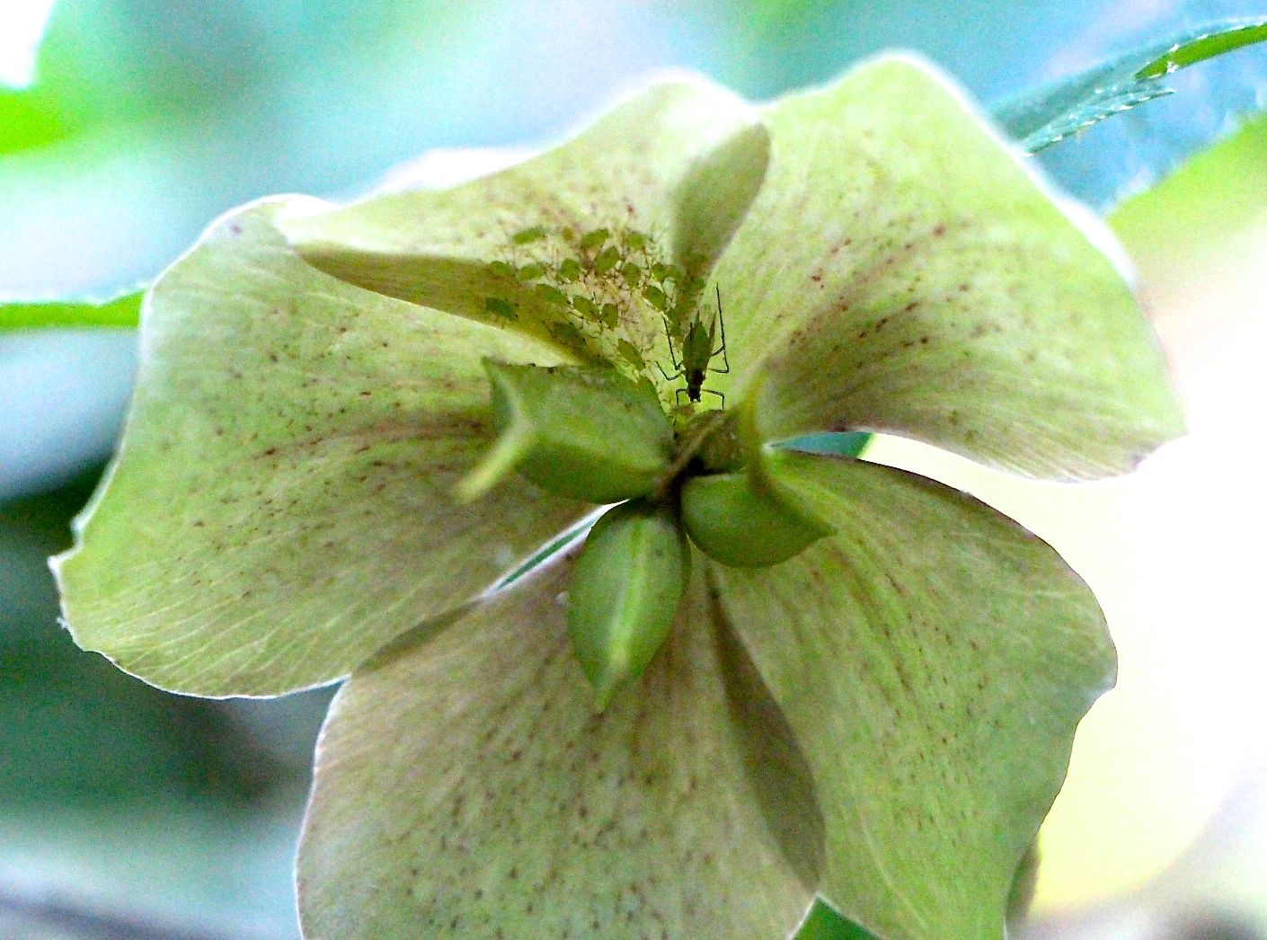 H gave me a new camera for my birthday, and I have been practicing close-up shots. Little did I know that a mama bug and her brood had parked themselves on one of my flowers (you have to look closely at the top petal). Who knew I had a maternity ward in the secret garden?