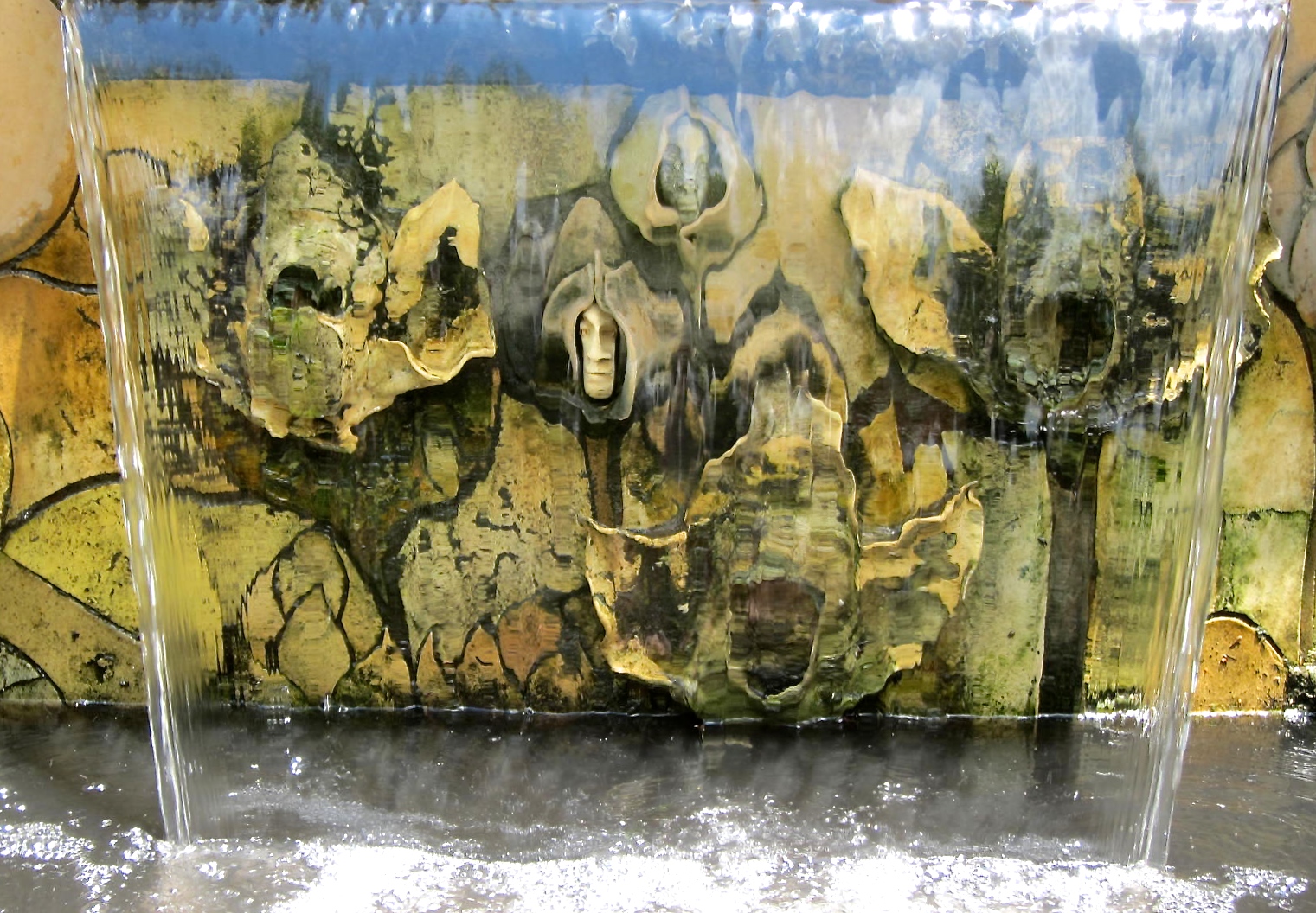 H and I have passed by this water fountain at the botanical garden many times but never noticed the relief sculpture behind the water until our last visit. Tiny ethereal faces peer out from organic plant life. Once I discovered them, I couldn’t stop staring.