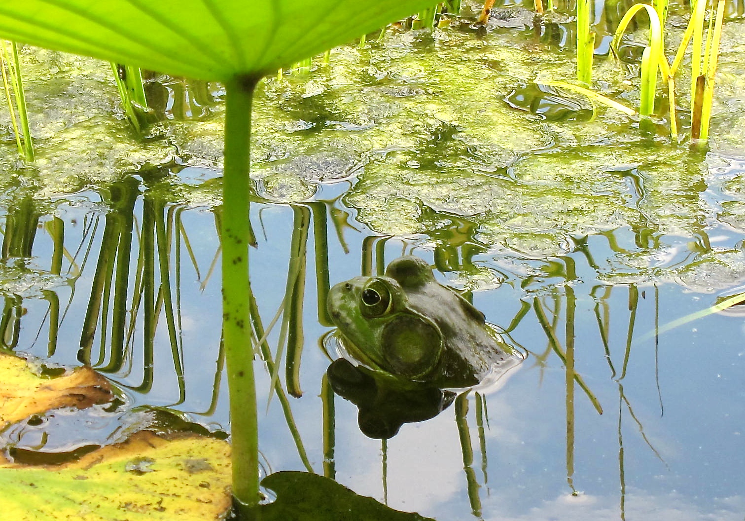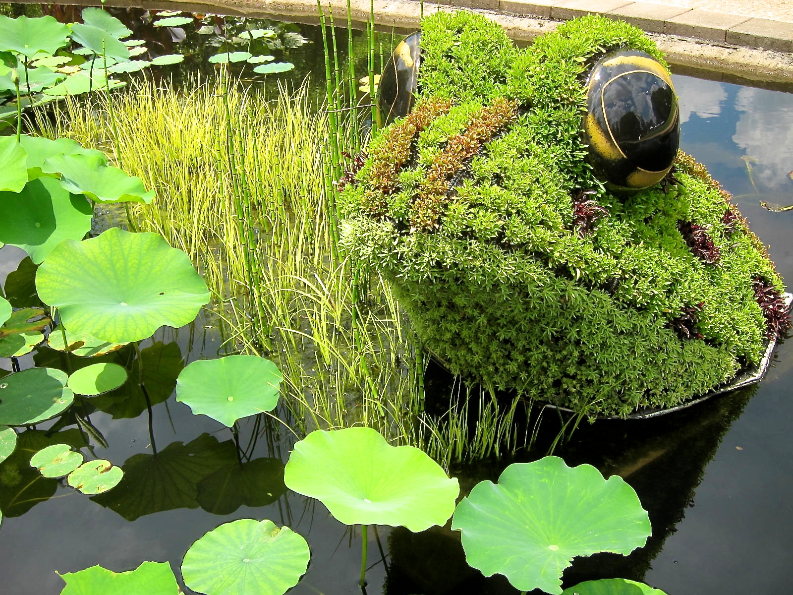 H and I recently encountered this frog sculpture in one of the ponds at the botanical garden. We were even more surprised when, in the nearby reeds, we discovered the real deal.