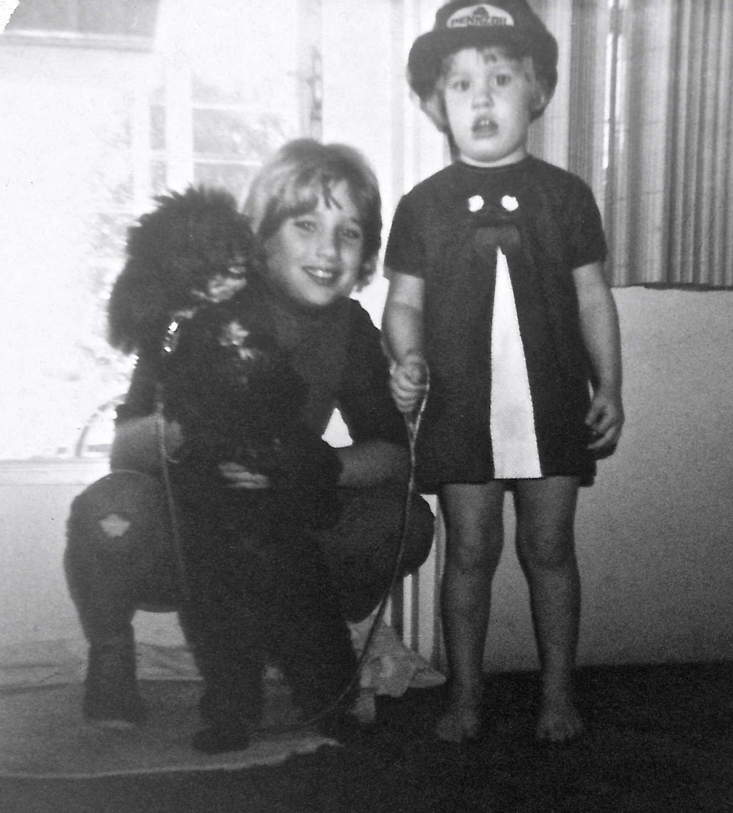 There’s something about this image that just cracks me up… perhaps the dazed look on my sister L’s face, her mismatched dress and cap, my ragamuffin outfit, or that wooly dog. But mostly, I think it’s because there’s a quirky sense that L is the one I’ll be taking for a walk.