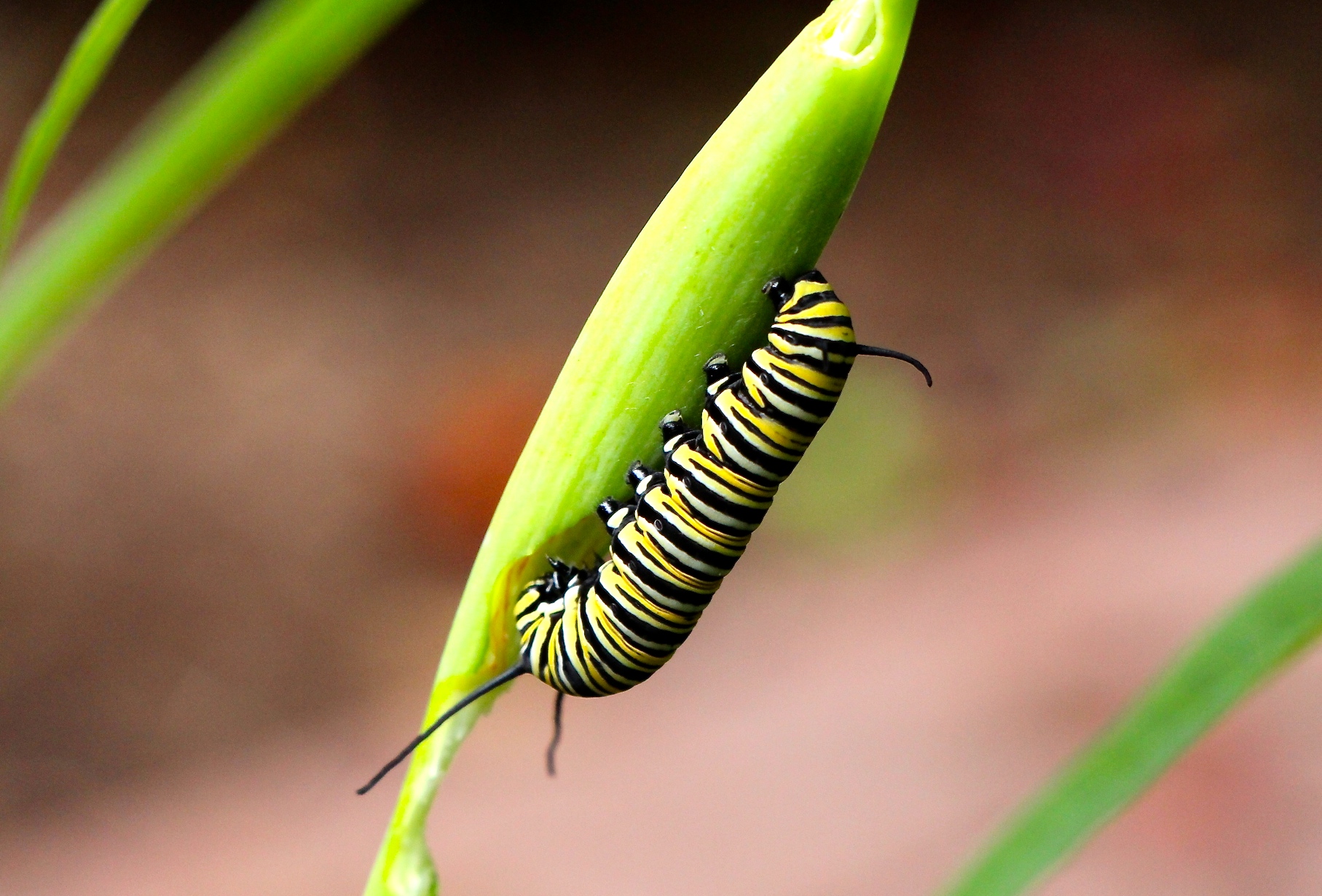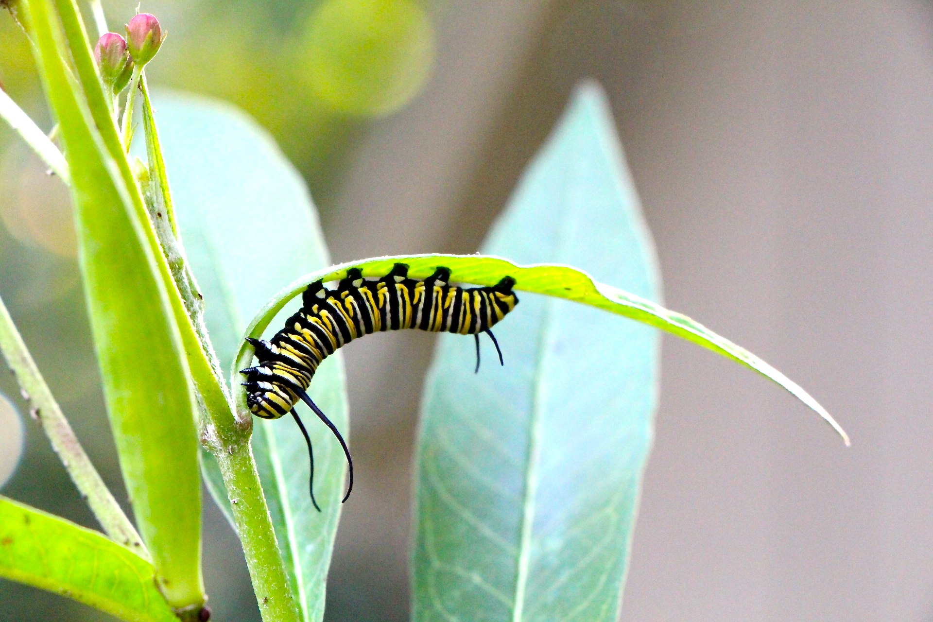 Faithful readers may recall that I planted two milkweed plants last April to attract monarch butterflies. Over the summer, I was a bit disappointed to see just one visitor flitting by, but I was also thrilled because one is certainly more than none. Imagine my astonishment last week when I discovered eleven fat and healthy monarch caterpillars munching happily on the pods and leaves!