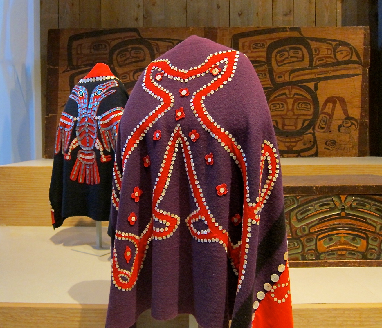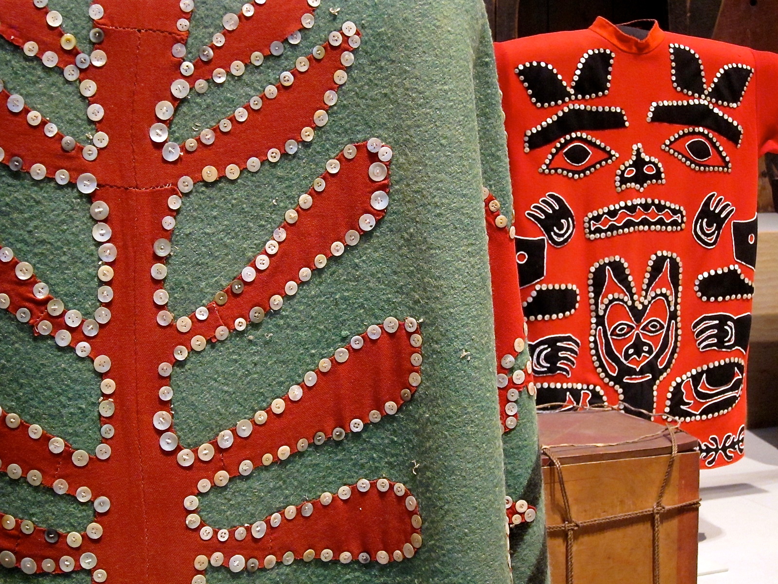 Last year H and I visited the Denver Museum of Art while in Colorado with family. One of my favorite exhibits was a presentation of button blankets, ceremonial outerwear worn by Northwest Coastal Tribes. These hand-stitched capes were made of wool blankets and embellished with buttons, abalone, mother-of-pearl, and other small shells. The designs and crests identify the wearer’s family history. It was a gorgeous display of vibrant colors, textures, and stories just calling to be touched (which we couldn’t) and admired (which we did).