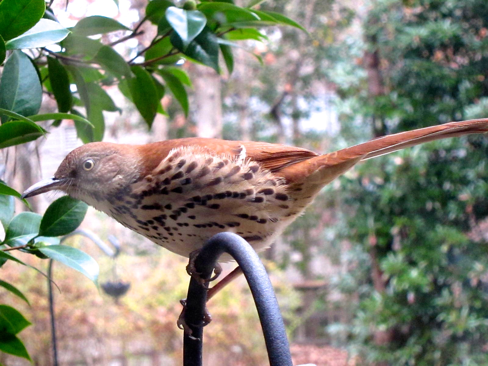 Brown thrashers usually spend their time on the ground in the underbrush and shrubs rooting around for their meal. This fellow, however, keeps showing up at the feeder outside our window, obviously enjoying the easy pickin’s of a quick snack.