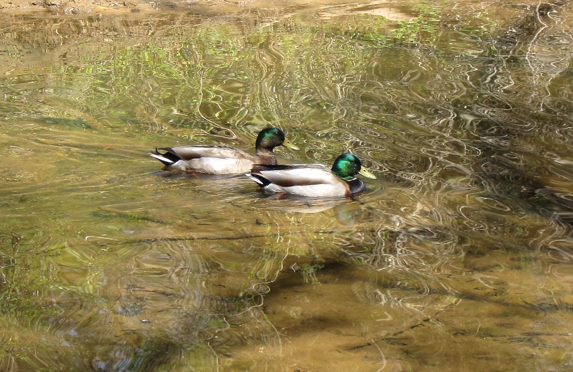 What a crazy contrast between the busy patterns reflecting off the water and these mallards quietly paddling by.