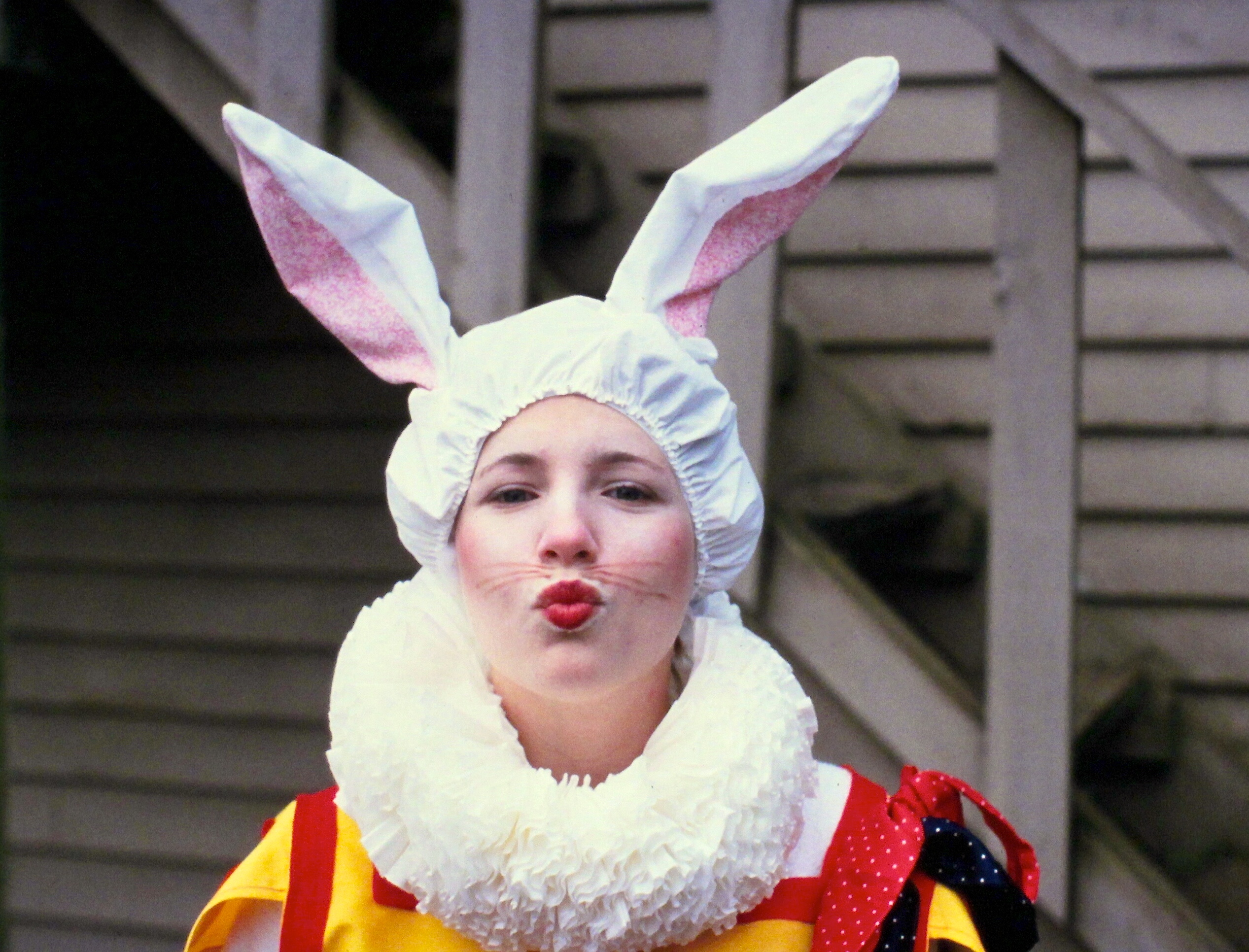 Back in the days when the only part of our Halloween costumes that might have been purchased was the mask (such as Sista L’s cat face), we were very creative. My hobo attire appears to be a combination of birthday outfits… blue party pants with oversized white shirt and the ever-popular red celebration blouse.